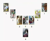 Позиции карт: Общее душевное состояние любимого; Эмоциональное отношение к Вам в прошлом; Влияние событий прошлого на любимого; Влияние событий настоящего; Влияние окружения; Эмоциональное отношение к Вам в будущем; Конечный результат.